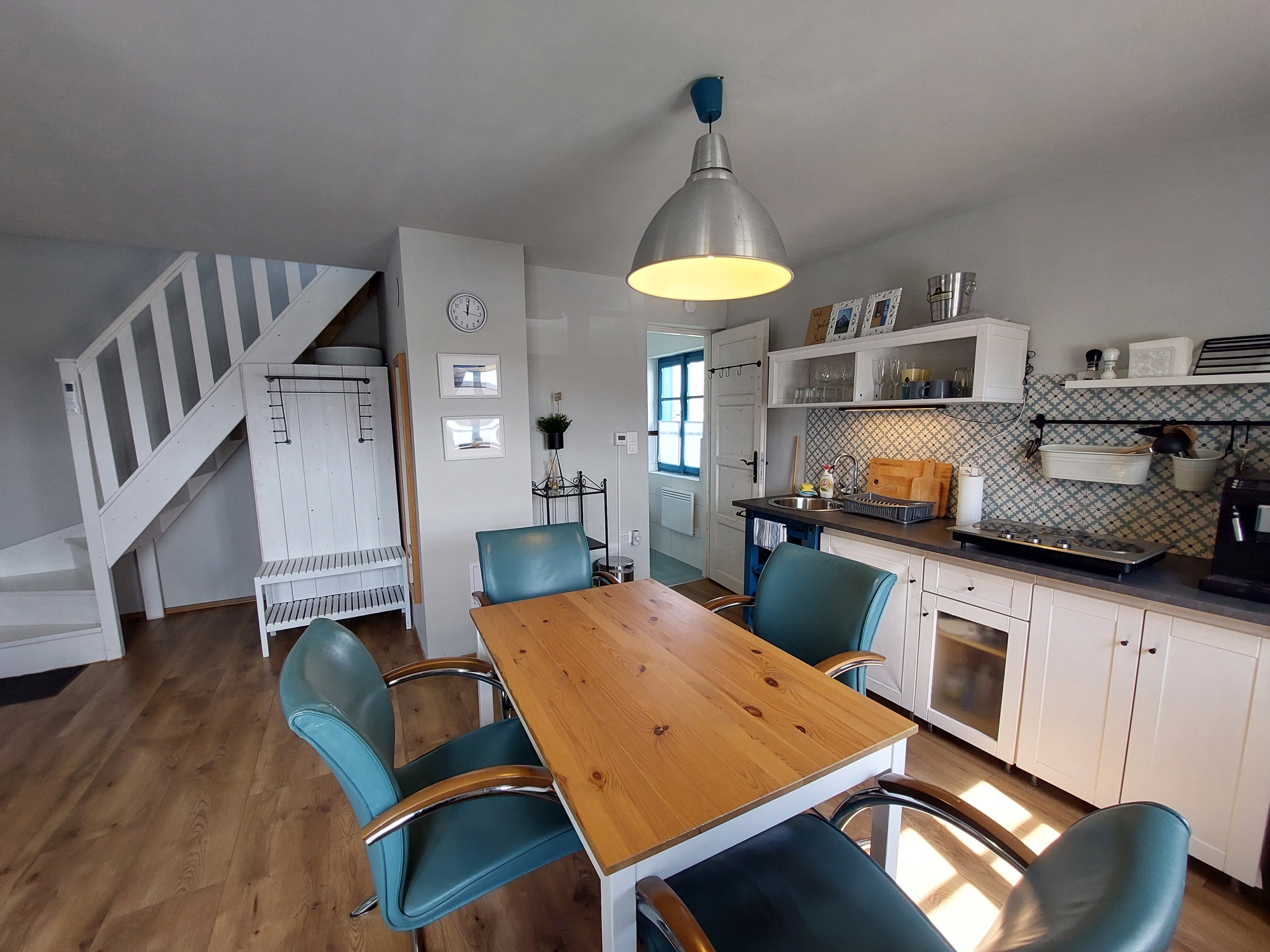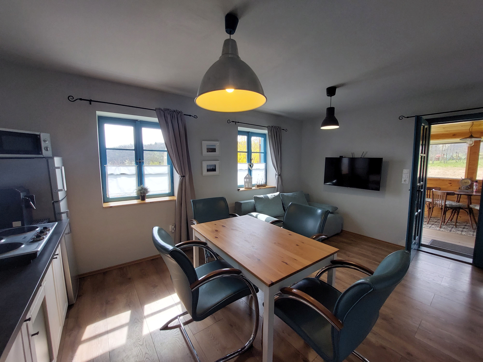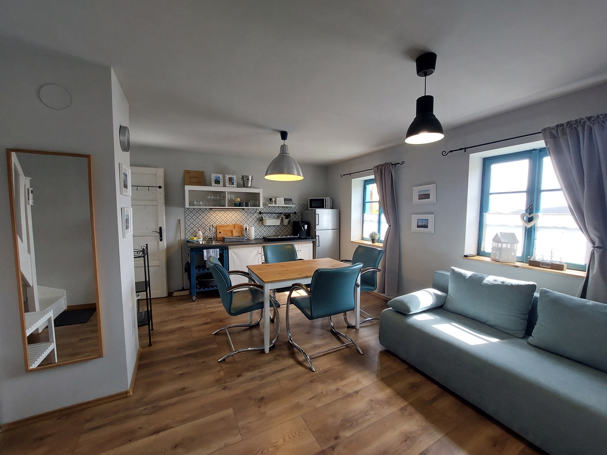 Das Gästehaus bietet Platz für 4-5 Personen und hat eine Fläche von ca. 50 m2. Im Erdgeschoss befinden sich ein Wintergarten, ein offener Küchen-Ess-Wohnbereich und ein Badezimmer mit Dusche. Im Obergeschoss gibt es ein Schlafzimmer.